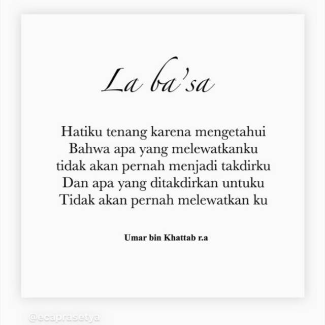Hatiku tenang karena mengetahui bahwa apa yang melewatkanku tidak akan pernah menjadi takdir ku dan apa yang di takdirkan untukku takkan pernah melewatkan ku — umar bin khattab.